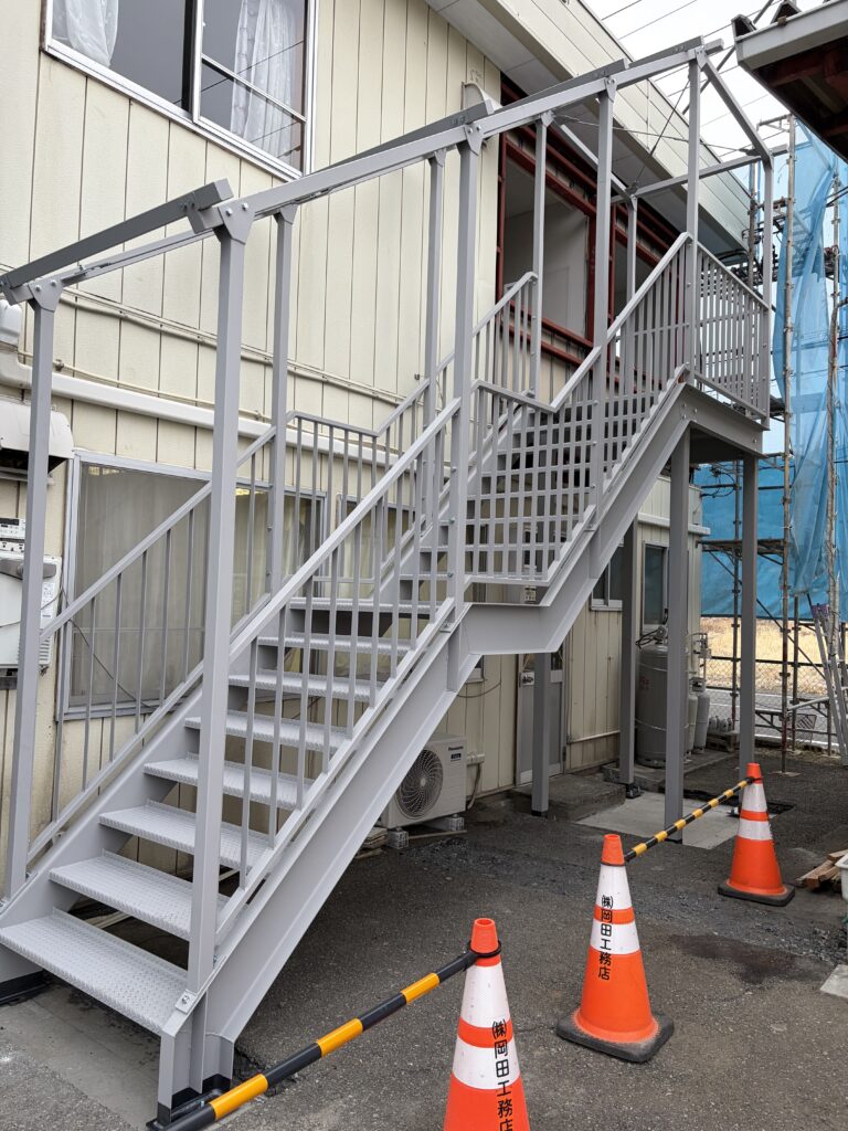 先日、秩父市内にある工場の事務所ビルで外階段の設置工事を行いました。
