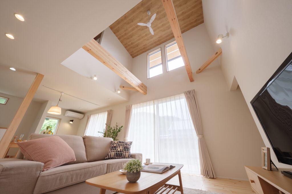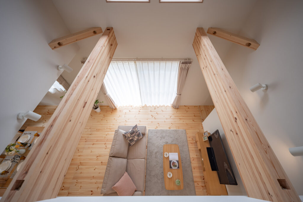 吹き抜けから自然光がたっぷりと降り注ぎ、季節の変化を感じながら暮らす開放的なリビング。