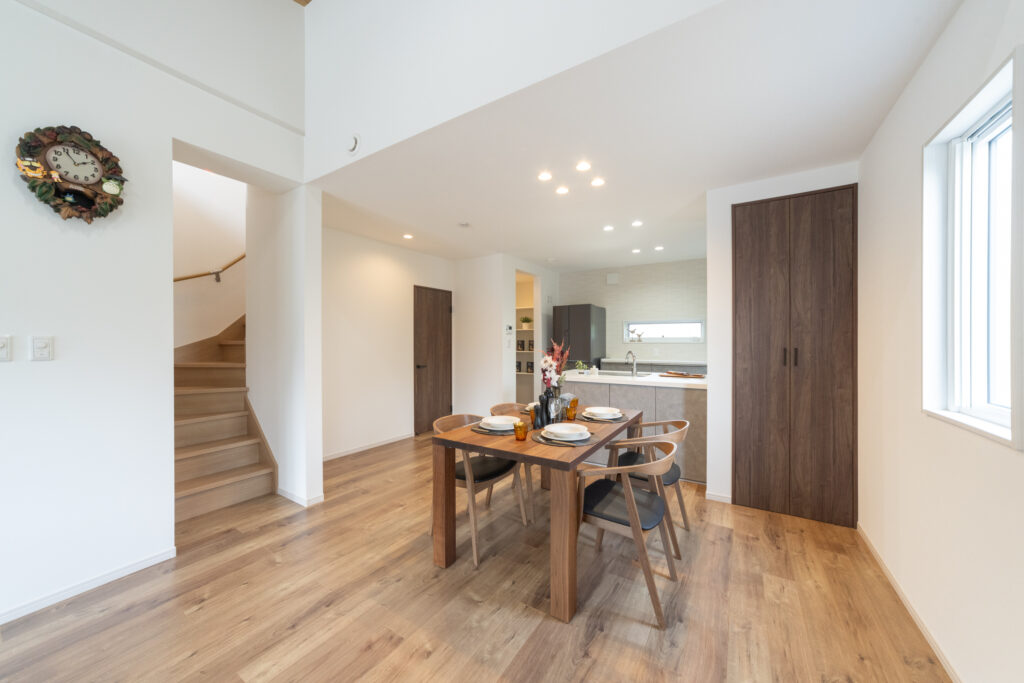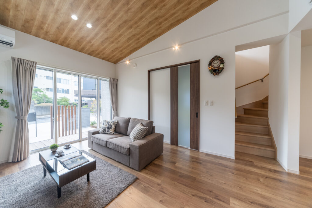 玄関を抜けると、勾配天井が広がる開放的なLDKが迎えてくれます。