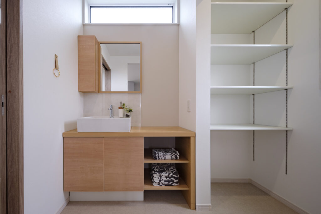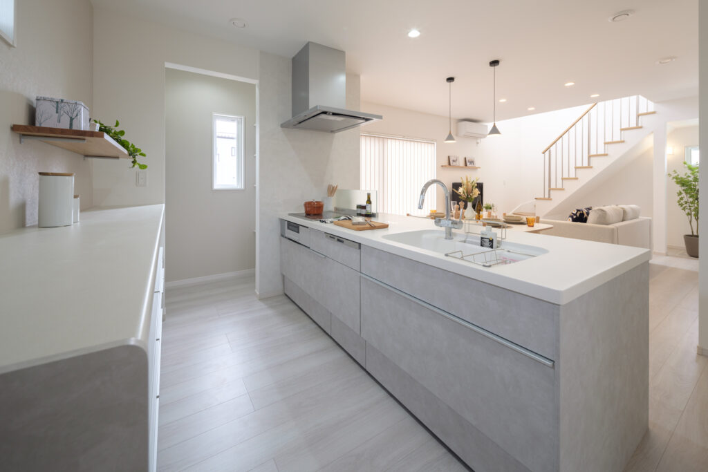 アイランドキッチンや収納スペースも確保し、機能性とデザイン性を両立しました。